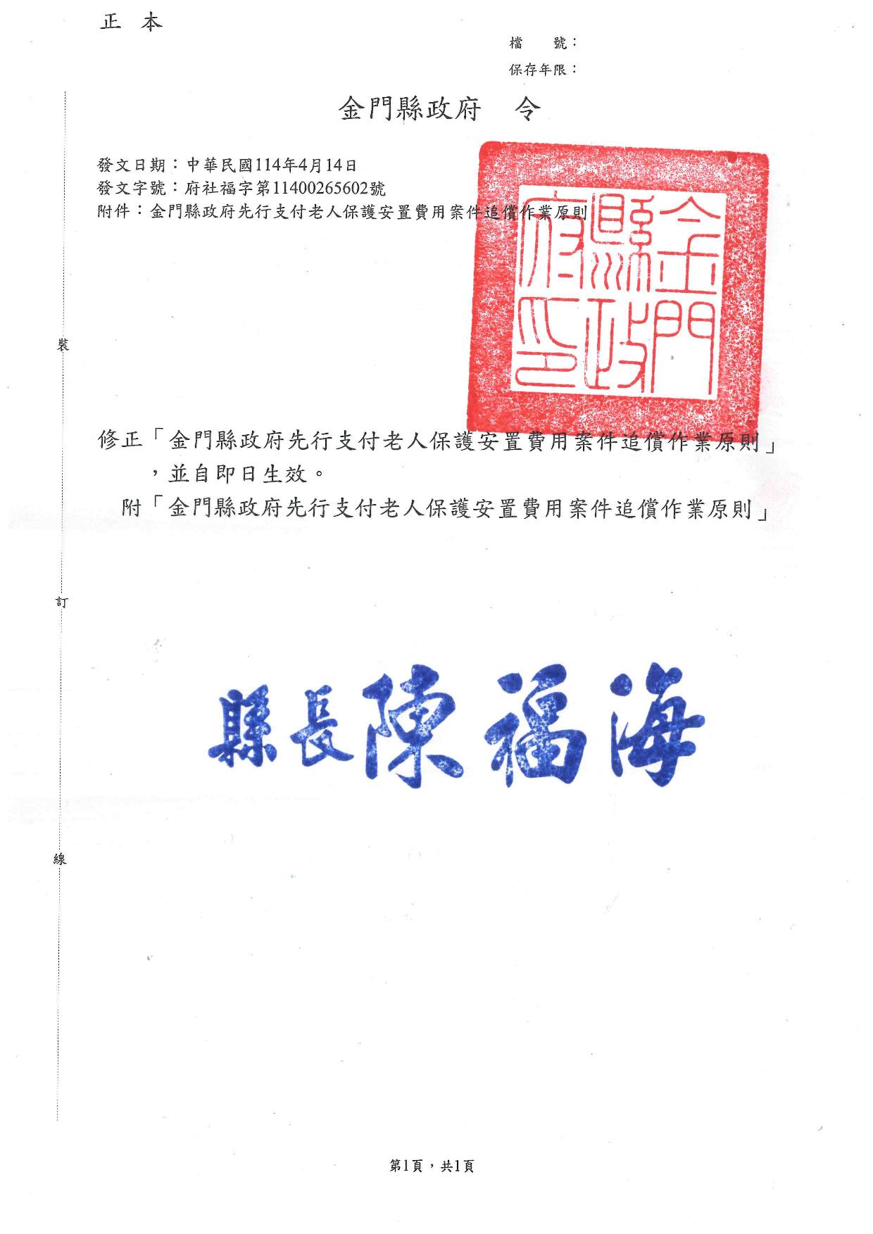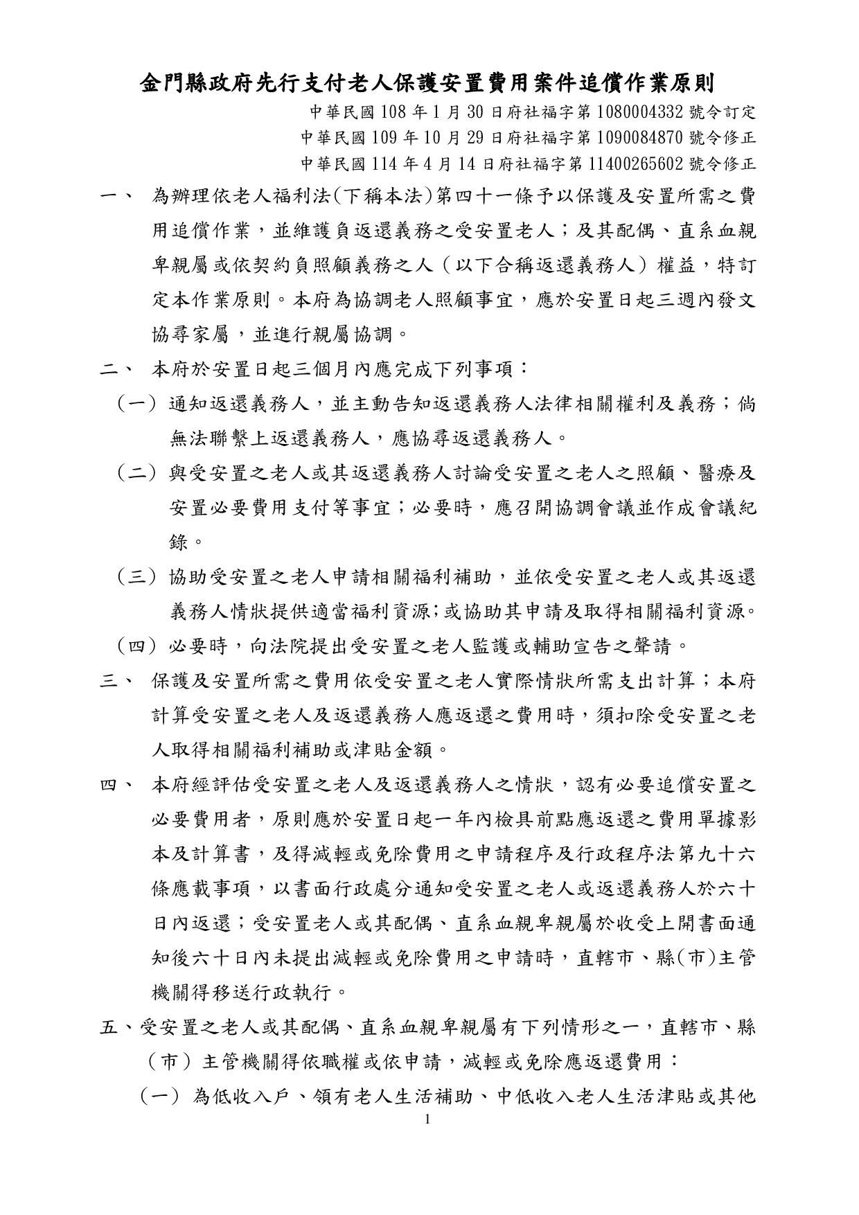 金門縣政府先行支付老人保護安置費用案件追償作業原則