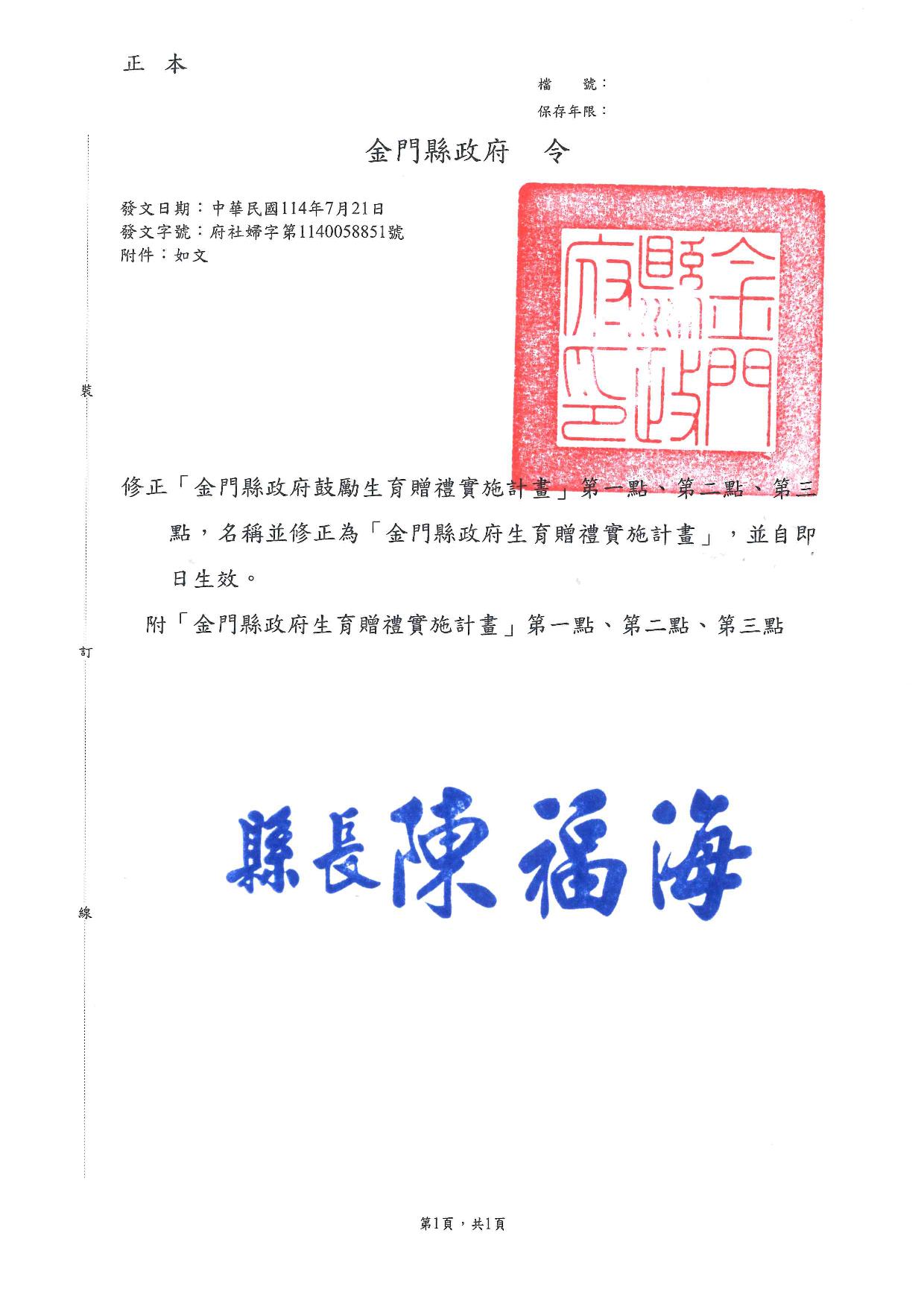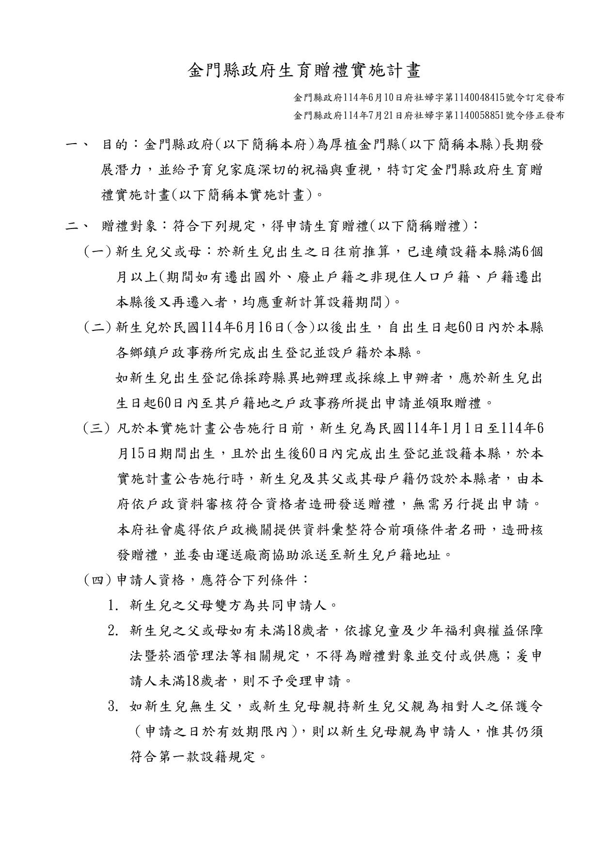 金門縣政府生育贈禮實施計畫
